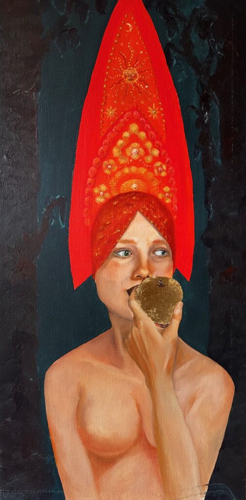 In mijn werk onderzoek ik de raakvlakken tussen Slavische heidense rituelen en sprookjes, en de tradities die zich duizenden kilometers verder binnen de orthodoxe kerk hebben ontwikkeld. Het beeld van de vrouw en haar kracht staat centraal in mijn interpretatie van deze verhalen, waarin vrouwen vaak de hoofdrol spelen en de essentie van hun cultuur belichamen.
